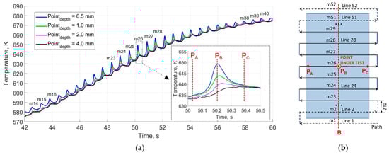 The temperature evolutions at different depths of the measuring point during each trajectory or line of the path are shown in Figure 10a. First, an increase in the temperature of the homogeneous substrate as the torch advanced along the path was observed. Specifically, an increase in temperature was observed from 575 K approx. to 675 K approx., from trajectory number 14 (m14) to number 40 (m40). The temperature peaks during each line or trajectory of the spray path were observed in temperature evolution. A typical pattern of temperature evolution generated for all lines of the path was due to the plasma plume movement during each trajectory or line of the path. In each path trajectory, the temperature increased as the plasma plume moved from the beginning to the centre of the trajectory. The peak of this pattern corresponded when the plasma plume was over the point of the trajectory of the path that was Y-axis-aligned with the placement of the point under test (the plasma plume crosses the dotted red line B in Figure 10b and in Figure 10a inset), and subsequently decreases as it moved away from it. These temperature peaks increased as the torch approached trajectory number 26 (m26), corresponding to the passage of the torch flame over the measurement point, which is point PB in Figure 10b and in the Figure 10a inset. Then, the peaks decreased as the trajectories move away from the measurement point. On the other hand, the inset of Figure 10a showed the temperature values for different depths, Pointdepth. The temperature peaks were lower as Pointdepth increased. A small time delay for the peaks appeared due to conduction heat transfer through the substrate with the depth.