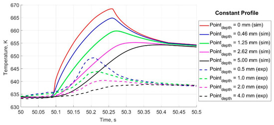 Comparison of the temperature evolution at different depths, Pointdepth, of the point under test during the coating process. Simulation with a constant flame profile (continuous line) and experimental measurement (dashed line).