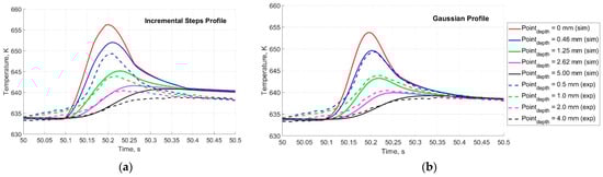 Comparison of the temperature evolution at different depths, Pointdepth, of the point under test during the coating process. Simulation with (a) incremental steps and (b) Gaussian flame profiles (continuous line) and experimental measurements (dashed line).