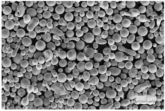 The matrix material used for the test in this paper is EA4T axle steel developed by Siemens, Germany, which belongs to low carbon and low alloy steel, and its main chemical composition is shown in Table 1. The powder used in the experiment were spherical Fe314 powders (provided by BGRIMM Advanced Materials Science & Technology Co., Ltd., Beijing, China) with particle diameters of 90–120 μm (as shown in Figure 1), the powder fluidity is 30.78 g/s, the bulk density is 4.537 g/cm3, the thermal expansion coefficient of Fe314 is similar to that of EA4T steel, and the main chemical composition is shown in Table 2.