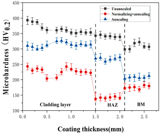 As shown in Figure 5, the fused cladding layer undergoes different heat treatment processes and exhibits varying microhardness. The untreated cladding layer sample demonstrates a relatively gradual change in microhardness, with a maximum microhardness of 393.2 HV and an average microhardness of 368.67 HV. Following the annealing treatment at 550 °C for 2 h, the average microhardness of the fused cladding decreases to 308.73 HV, approximately 16.26% below the untreated condition. Subsequently, the fused cladding sample subjected to secondary normalization and annealing exhibits the lowest microhardness, with an average value of 228.05 HV, representing a reduction of approximately 38.14% compared to the untreated state. These hardness changes are closely related to the evolution of the microstructure, as confirmed by the microscopic examination and XRD test results. The annealing treatment does not induce phase transformation in the cladding layer, but rather alleviates the internal structure of the grains, leading to a reduction in internal stress and, consequently, a decrease in material hardness. In contrast, the secondary normalization and annealing treatment further alters the material’s phase composition and lattice structure; the normalization treatment results in the complete transformation of the existing carbide phase into a single-phase austenitic structure. During the annealing process, numerous fine M7C3 particles precipitate from the austenitic phase boundaries, leading to a significant reduction in microhardness. By comparing the microhardness of the substrate, it can be seen that the average microhardness is 308.82 HV. After annealing treatment, the microhardness of the substrate is reduced to 207.48 HV on average, which is about 32.82% lower than that of the unheat-treated state. After the second normalizing + annealing treatment, the microhardness of the fused cladding samples was the lowest, with an average microhardness of 175.63 HV, which indicates that the heat treatment also has an obvious improvement effect on the microhardness of the matrix.
