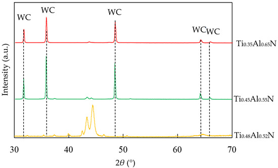 TiAlN coatings with different Al content were prepared by using Ti:Al atomic ratios of 60:40, 50:50 and 40:60 targets, respectively. The EDS results showed that the coatings were Ti0.48Al0.52N, Ti0.45Al0.55N and Ti0.35Al0.65N, respectively. It can be seen that the content of Al in the coating is slightly higher than in the target, because when the target was bombarded by an arc, the high temperature caused the evaporation of the Al and Ti elements. The melting point of Al was lower than Ti, resulting in the evaporation rate of Ti being slightly lower than that of Al. The XRD of TiAlN coating with different contents is shown in Figure 4.