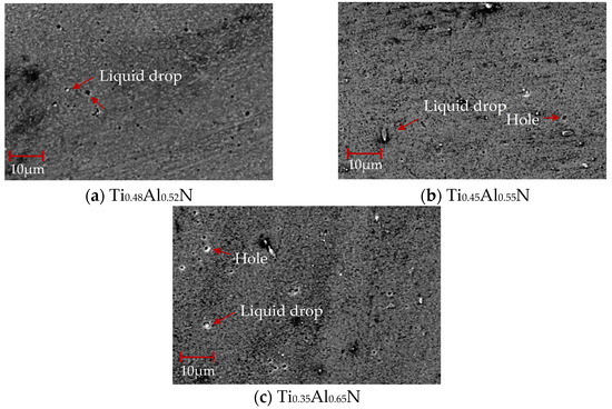 The SEM morphology of TiAlN coatings with different content is shown in Figure 5. It can be seen that with the increase of Al content, the particles on the surface of the coating became larger and the density decreased. The shape of the particles also changed from dense particles to large particles. The reason for this change in particle shape is mainly because the hexagonal AlN structure generated in the coating process changes the phase composition and grain orientation. With the increase of Al content, droplets and pores increase significantly, which will affect the coating quality.