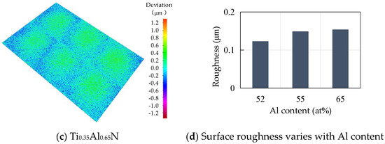 Roughness is an important factor affecting the performance of tool coatings. Too much roughness will lead to an increase in cutting force and cutting temperature, accelerate tool wear, and reduce tool life and workpiece processing quality. As the base layer acts as a transition layer between the functional layer and the substrate layer, surface roughness affects the binding force and performance of the coating. The surface morphology of TiAlN coating with different content is shown in Figure 6. Surface roughness increases with the increase of Al content. When the atomic percentage of Al is 52%, the surface roughness is the lowest, at about 0.123 μm, and with the increase of Al content, the surface roughness increases rapidly. When the atomic percentage of Al element reaches 55%, the surface roughness is close to 0.15 μm. The change of surface roughness is not obvious when the atomic percentage of Al element is 65%; the surface roughness increases by only 0.004 μm to 0.154 μm.