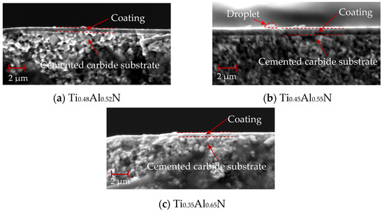 The cross-section morphology of TiAlN coating with different content is shown in Figure 7, and the bottom is the WC–Co cemented carbide substrate with a coating thickness of about 1 μm. As shown in Figure 7a, TiAlN coating has an non-dense columnar or fibrous structure. Compared with Figure 7b and Figure 7c, the columnar or fibrous structure weakens significantly with the increase of Al content. This is due to the increase of AlN content in the hexagonal wurtzite structure.