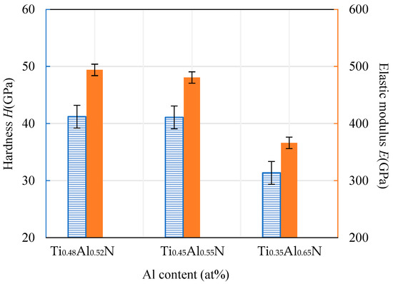 Hardness and elastic modulus of TiAlN coatings with different content.