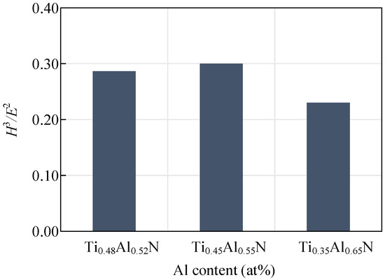 The hardness and elastic modulus of the coating can reveal the wear resistance of the tool, which is generally expressed by H3/E2. The wear resistance of the coating increases with the increase of the H3/E2 value. Figure 9 shows the change curve of the H3/E2 value of coatings with different Al content. With the decrease of Al content, H3/E2 values first increased and then decreased. A coating with a small elastic modulus can tolerate more elastic deformation before failing. The coating will last longer if more work completed by the outside world is absorbed. At the same time, when the elastic modulus of the coating and the substrate tends to be consistent, the binding strength of the coating and the substrate will be increased. It is known that the elastic modulus of the WC-Co-0.1Re carbide is about 600 GPa, and the Ti0.45Al0.55N substrate coating with a higher elastic modulus will give the tool higher wear resistance.