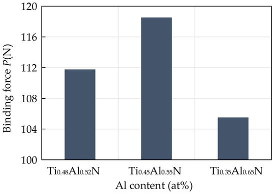 In addition to the hardness and the H3/E2 value, the binding force between the coating and the substrate is also an important parameter to reflect the performance of the coating tool. It is an important indicator of the excellent performance of the coating. Due to the difference in thermal expansion coefficient, elastic modulus and crystal structure between the coating and the substrate, the interface between the coating and the substrate will produce a large amount of stress. This will make the coating flake easily and fail under the action of stress in the cutting process. A scratch test was carried out on the surface of the coating with a scratch length of 3 mm and a linear termination load of 200 N. When the scratch entered the peeling area from the sliding area, the critical load applied was the binding force of the coating. The influence of different contents of TiAlN on the binding force of the coating is shown in Figure 10. The critical load increased first and then decreased with the increase of Al content. The results show that the binding force of the coating first increased and then decreased with the increase of Al content. When the Al atomic content was 55%, the binding force of the coating was at its highest, which was 118.53 N.