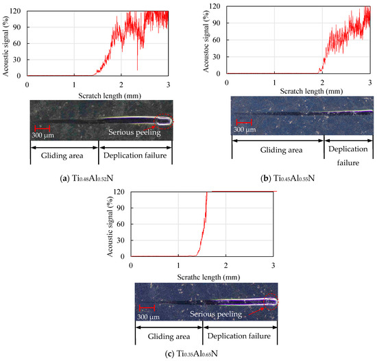 The scratch morphology of the TiAlN coatings with different content is shown in Figure 11. By observing the scratch morphology, it was found that the Ti0.45Al0.55N coating in Figure 11b had the longest sliding area, which was about 1.9 mm. The sliding area first increased and then decreased, and at the end of the scratch, an obvious peeling phenomenon could be observed.