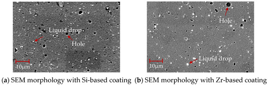 The hardness and elastic modulus of the Si-based coating and the Zr-based coating are shown in Figure 17. It can be seen that the hardness of the Si-based coating was about 28.07 GPa and the elastic modulus was about 384.17 GPa. The hardness of Zr-based coating was about 30.34 GPa and the elastic modulus was about 424.48 GPa. The addition of Zr improved the compactness of the Si-based coating, resulting in an increase in hardness by 8.09% and an increase in elastic modulus by 9.65%.