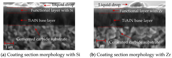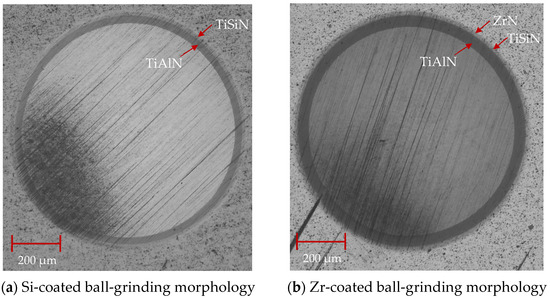 As shown in Figure 13, the cross-sectional SEM morphology of the coatings with different functional layers was found to contain droplets on the surface. The internal structure of the coating was observed. As is shown in Figure 13a, the cross-sectional morphology of the Si coating can be divided into three parts: the cemented carbide substrate, the base layer and the functional layer. The coatings of the base layer and functional layer are uniform and dense without pores. As shown in Figure 13b, the cross-sectional morphology of the Zr-based coating can be divided into four parts: the cemented carbide substrate, the base layer, the functional layer and the lubricating layer. A layer of ZrN coating is deposited on the surface of the Si-based coating. The coating has a dense morphology, no pores inside and a uniform film thickness. Figure 14 shows the ball-grinding morphology of coatings with different functional layers. As shown in Figure 14a, the thickness of TiAlN coating is about 1.27 μm, the thickness of TiSiN coating is about 0.77 μm and the total coating thickness is about 2.04 μm. Figure 14b shows the cross-sectional morphology of the Zr-based coating. The thickness of the TiAlN coating is about 1.71 μm, the thickness of the TiSiN/ZrN coating is about 1.04 μm and the total coating thickness is about 2.75 μm. The thicknesses of the Si- and Zr-based coatings are similar. The cross-sectional morphology of the coating is good and the film thickness is uniform.