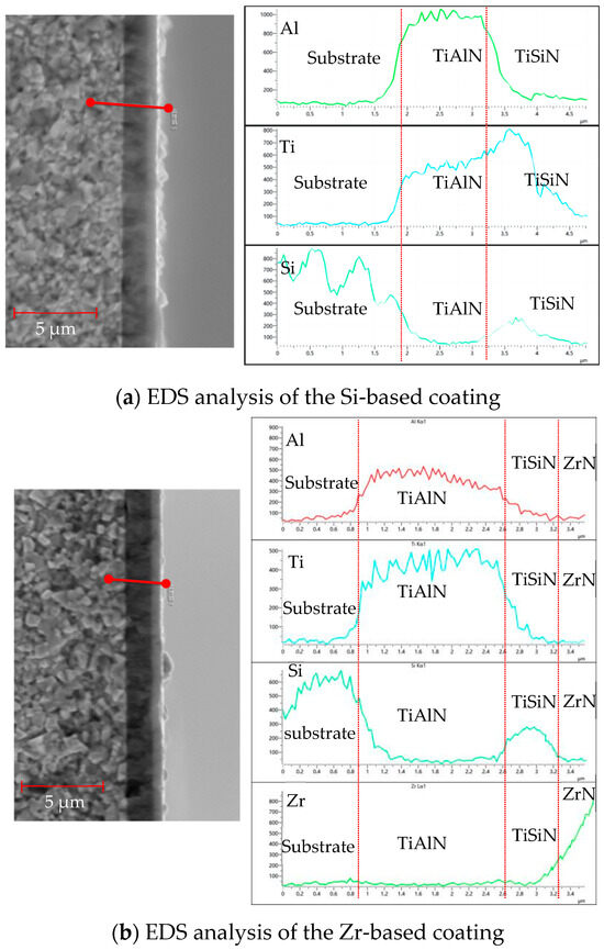 Figure 15 shows the EDS analysis of the cross-sections of different functional layers. As shown in Figure 15a, the EDS analysis of the Si-based coating shows that, at a distance of 1.5 μm, the Al element content increased and the base coating started to deposit at 3.2 μm. The content of Al elements decreased, the deposition of the functional layer began, and the content of Si and Ti elements increased. The increase observed in the content of the W element should be due to the Si element, because the electron energy peak of Si is close to W and cannot be accurately identified. To observe the ball-grinding morphology of the Si coating, please refer to Figure 14. As shown in Figure 15b, the EDS analysis of the Zr-based coating shows that, at 0.8 μm, the Al element content increased and the base layer coating began to be deposited. At 2.6 μm, the Al element content decreased and the deposition of the functional layer began; the Si element content also increased and the TiSiN functional layer was deposited. When the deposition reached 3.2 μm, the Zr element content began to increase and the ZrN coating was performed. The deposition was completed when the deposition reached about 3.5 μm.