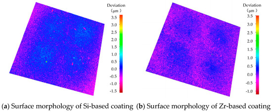 The critical load of the Si-based coating and the Zr-based coating is shown in Figure 19. The critical load indicates the bonding strength of a coating. It can be seen from this figure that the bonding strength of the Si-based coating and the Zr-based coating is equivalent. Among them, the Si-based coating was slightly larger than the Zr-based coating.