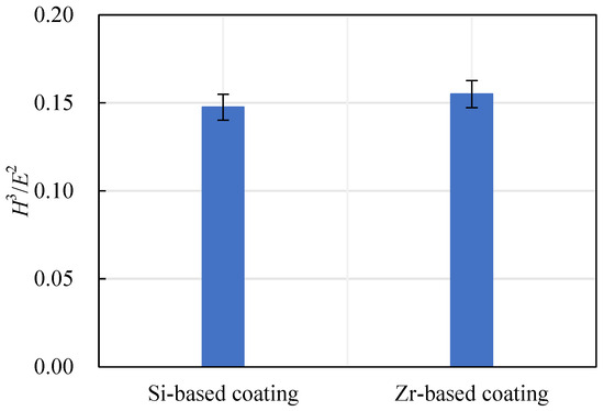 The ratio of hardness to elastic modulus reflects the wear resistance of a coating, expressed as H3/E2. The wear resistance of a coating increases with the increase of the H3/E2 ratio. The Si-based coating and the Zr-based coating H3/E2 are shown in Figure 18. With the addition of Zr element, the H3/E2 ratio increased from 0.15 to 0.16, indicating that the wear resistance of the coating had been further improved.