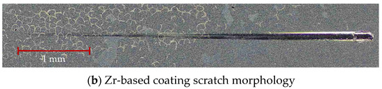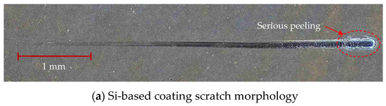 Figure 20 shows the scratch morphology of the coating after the bonding force test. The total length of the scratch was 5 mm, the loading speed was 100 N/m and the end load was 200 N. As can be seen from the figure, there was no obvious peeling during the entire loading process. The surface quality of the Si-based coating was good in the early stage of scratching. As the load continued to increase, the scratch morphology of the Si-based coating peeled off and showed cracks in the final stage. The scratch morphology of the Zr-based coating was good, indicating that the coating bonding strength was enhanced with the addition of Zr element.