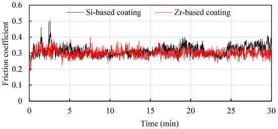 In order to study the friction reduction mechanism between Si and Zr functional layers and titanium alloys, titanium alloy friction tests were conducted on coatings with different compositions [22]. Ti6Al4V balls with a diameter of 5 mm were used to rub back and forth on the coating surface at a friction speed of 240 mm/min. The friction pressure was 10 N and the friction time was about 30 min. The results are shown in Figure 21. It can be seen that in the early stage of friction testing, the friction coefficient fluctuated greatly, which was mainly affected by the surface quality of the coating. As the friction time increased, it entered a stable stage. The average friction coefficient of the Si-based coating was 0.315, and the average friction coefficient of the Zr-based coating was about 0.299. The friction coefficient of the Zr-based coating was better than the Si-based coating. This is mainly because adding Zr element to the Si-based coating can improve the density of the coating and reduce the roughness of the coating surface, which is beneficial to the reduction of titanium alloy. The cutting force during cutting reduces the cutting heat generated caused by friction, protects the tool and extends the cutting life.