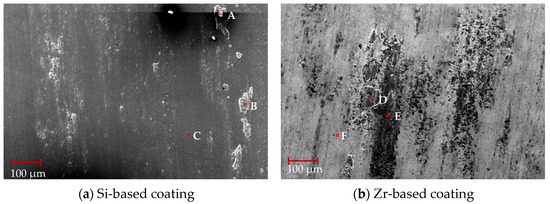 SEM was used to observe the surface wear scar morphology after friction and wear between the Si-based coating, Zr-based coating and titanium alloy. The results are shown in Figure 22. From Figure 22a, it can be seen that the Si-based coating surface bonding is obvious, and the main bonding areas are on the left and right sides of the friction area. Compared with Figure 22b, although the Zr-based coating has a lower friction coefficient, the coating obviously peels off and the peeling phenomenon is serious. This is due to the lubricating effect of the Zr element and the low hardness of the Zr-based coating. Peeling occurs during reciprocating friction.