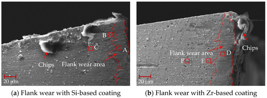 A surface scan was performed on the flank wear area, and the EDS analysis of coatings with different compositions after 0.5 min of processing is shown in Table 8. The analysis of point A revealed the existence of a small amount of V element. The V element mainly comes from Ti6Al4V, indicating that Ti6Al4V combines with the Si coating to form a smooth flank wear area. The analysis of point D found that a small amount of Si element existed, which shows that during the process, the Zr element in the TiSiN/ZrN coating slipped off and the Si element was exposed, ensuring the hardness and wear resistance of the tool coating. When comparing point D with points E and F, it can been seen that the content of Ti element increased significantly. This indicates that the Ti element had diffused into the Zr-based coating. The occurrence of element diffusion will lead to a reduction in the hardness of the coating and reduce the performance of the tool coating.