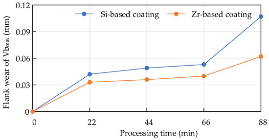 When Ti6Al4V was milled with cemented carbide endmills with different coatings, the flank wear value changed within the same period of time, as shown in Figure 25. Within 88 min, the overall coating was at a stable wear stage. For the Zr-coated flank surface, the wear value was smaller than that of the Si-based coating, indicating that the Zr-based coating had better wear resistance and was more conducive to improving the cutting life of the tool.