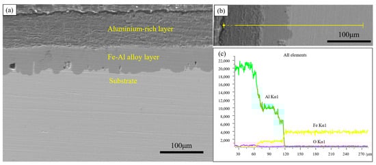 Cross-sectional morphology and EDS line scan of hot-dip aluminium coating (a) cross-sectional morphology; (b) line scan morphology; (c) line scan results.