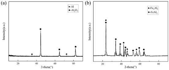 Since the outermost part of the hot-dip plating layer is an aluminium-rich layer, the sample was immersed in a 1 mol/L NaOH solution to investigate the compositional composition of the Fe-Al alloy layer using XRD. After the aluminium-rich layer was completely removed from its surface, the exposed Fe-Al alloy layer was analysed. Figure 3 shows the XRD results of the two layers, respectively. As shown in Figure 3a, the surface aluminium-rich layer is mainly composed of Al, and part of the Al is oxidised to Al2O3 by air. Figure 3b shows that the main compositions of the Fe-Al alloy layer were the Fe2Al5 phase and FeAl3 phase. The formation of these two phases is related to the diffusion process of Fe and Al atoms. Combined with the binary phase diagram in Figure 4, the molten aluminium solution diffuses with the partially melted steel substrate during the hot dip aluminium plating process. The intermediate layer formed by diffusion contains between 70% and 75% aluminium atoms, resulting in the formation of the Fe2Al5 and FeAl3 phases at 700 °C. The Fe2Al5 and FeAl3 phases are formed at 700 °C. The formation mechanism of these two phases is that the iron and aluminium atoms diffuse into each other, first forming the low iron content FeAl3 phase with an aluminium atom saturation of 75%. With further diffusion of matrix iron, a high iron content Fe2Al5 phase is formed [,].