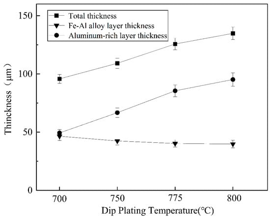 As shown in Figure 6, the total thickness of the plated layer shows an increasing trend with increasing dip plating temperature, while the thickness of the surface aluminium-rich layer decreases slightly and the thickness of the intermediate Fe-Al alloy layer increases significantly. The aluminium-rich layer on the surface is formed by adhesion during the lifting and pulling process. As the liquid aluminium fluidity increases with temperature, the liquid aluminium adhering to the surface of the specimen is more likely to slip off, which leads to a reduction in the thickness of the aluminium-rich layer. The Fe-Al alloy layer is formed by the mutual diffusion of aluminium atoms in the molten aluminium liquid and iron atoms in the steel matrix. As the temperature rises, the more Fe-Al metal compounds are formed by diffusion, the greater the thickness of the intermediate alloy layer. At the same time, as shown in Figure 7, the increase in microscopic defects, such as holes, is due to the increase in oxide inclusions in the aluminium liquid due to the increase in temperature and the inability of the aluminium liquid to form a good wetting with the substrate. When cooling down the high-temperature aluminium liquid produces volume contraction, the microscopic stress leads to an increase in microscopic defects.