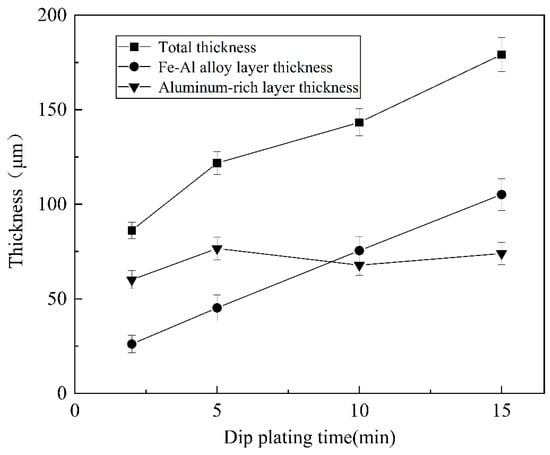 As shown in Figure 9, the thickness of the aluminium-rich layer on the surface varies slightly with increasing dip-plating time, and the thickness of the inner iron–aluminium alloy layer thickens significantly. The thickness of the aluminium-rich layer on the surface is mainly influenced by the lifting speed, independent of the dip-plating time, but the manually controlled lifting speed is prone to small errors, leading to fluctuations in the surface thickness. Figure 10 shows the cross-sectional morphology at different dip-plating times. With the increase in dip plating time, the iron and aluminium atoms continuously diffuse with each other, resulting in the Fe2Al5 phase continuously growing inside the steel matrix in a tooth-like manner and the thickness of the alloy layer increasing rapidly. Microscopic defects such as holes in the aluminium-rich and alloy layers did not produce significant changes with time. The diffusion of Fe-Al elements at the junction of the two gradually tends to be stable with an increase in time, so the interfacial demarcation line between the Fe-Al alloy layer and the surface aluminium-rich layer becomes more and more obvious and straight with the prolongation of time.
