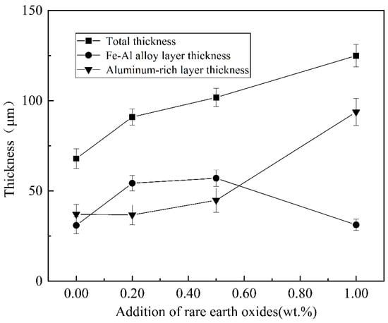 The cross-sectional morphology of the plated layers with different rare earth oxide contents was analysed, as shown in Figure 12. With the increase in rare earth oxides, the aluminium-rich layer and the alloy layer first become smooth and flat, and the morphology is better when the addition of rare earth oxides is 0.5%, and with the further increase in the addition, the defects such as holes and looseness in the plating layer increase. The thickness of the alloy layer is summarised in Figure 13, with the increase in rare earth oxides generally showing a trend of thickening and then thinning, while the thickness of the aluminium-rich layer changes in the opposite trend, generally showing a trend of thinning and then thickening.