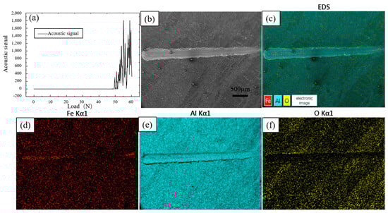 Scratch test and EDS results of hot-dip aluminium-plated specimens (a) Scratch test results; (b) Scratch surface topography; (c) EDS total results; (d) Fe EDS; (e) Al EDS; (f) O EDS.