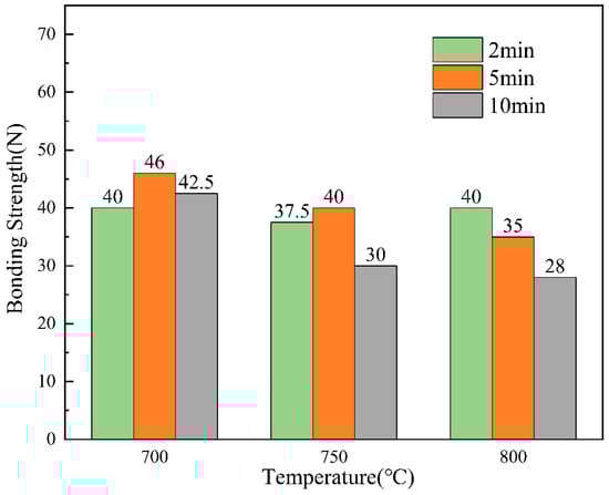 Figure 15 shows the results of the bonding strength under different dip plating parameters, which is closely related to the micromorphology of the coating, melt fluidity, etc. During the process of increasing the dip plating temperature, microscopic defects gradually appear on the uniform and dense surface of the coating, and at the same time, the fluidity of the molten aluminium solution increases and the bonding strength of the coating decreases. However, the further increase in temperature will lead to the acceleration of the diffusion of Fe and Al atoms, and the bonding strength of the coating will increase. Therefore, when the dip-plating time is short (2 min), the bonding strength of the coating decreases first and then increases. When the dip-plating time is more than 2 min, the interatomic diffusion will gradually stabilise, the increase in microscopic defects makes the densification of the coating worse, and the bonding strength of the coating will continue to decrease. The longer the dip plating time, the more fully the atoms diffuse, the denser the organisation of the Fe-Al layer will be, and the bonding strength of the coating will increase. At the same time, it will be accompanied by an increase in oxidation inclusions, and the organisation will become loose. When the dip plating temperature is less than 750 °C, the bonding strength first increases and then decreases, and the bonding strength of the coating continues to decrease when the dip plating temperature increases. To ensure that the subsequent anodic oxidation generated by the aluminium hydrogen barrier coating is well matched with the substrate, the hot-dip aluminium layer should have a sufficient thickness, good strength, uniform morphology, and a relatively flat interface. The steel substrate at a dip coating temperature of 700 °C, dip coating time of 5 min obtained after the coating interface is good, the thickness is moderate, the bonding strength of 49 N, the best overall performance.