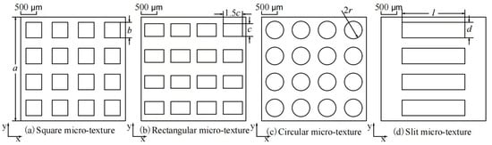 Figure 1a–d shows the two-dimensional (2D) model of surfaces with different micro-textures, including square micro-texture surface (Sq), rectangular micro-texture surface (Re), circular micro-texture surface (Ci) and slit micro-texture surface (Sl). The square micro-texture was composed of 16 square notches with a width of b on the substrate surface. The micro-textures were uniformly distributed on the substrate, and the area ratio between the total micro-textures and the substrate was denoted as area ratio S. Therefore, the relationship between the parameters a, b, and S can be expressed as Equation (1). Similarly, the rectangular, circular, and slit micro-textures were uniformly distributed on the substrate surface, with sizes of c, r, and d, where r was the radius of the circular micro-texture, and d was the width of the slit micro-texture, whose length was denoted as l. Notably, the length of the square micro-texture was considered as the base to guarantee the independence of the size and area ratio. The size of other micro-textures can be calculated via Equations (1)–(4).