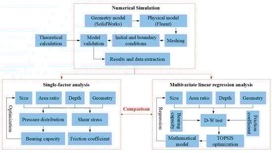 where Y denotes the surface property of bearing capacity or friction coefficient, X1, X2, X3, and X4 denote the size, area ratio, depth, and geometry, β1, β2, β3, and β4 denote the regression coefficients of the variables, and ε denotes the random disturbance. Finally, the Technique for Order Preference by Similarity to Ideal Solution (TOPSIS) was employed to determine the global optimal solution out of multiple solutions []. In the context of the Scientific Platform Serving for Statistics Professional (SPSSPRO), the TOPSIS method represents a methodology employed for the assessment of the degree of superiority or inferiority of a solution []. In spatial stochastic simulations, multiple potential solutions are typically generated. The superior–inferior solution distance method can be employed to ascertain the relative merits of the solutions by calculating the distances between them. This method can assist in identifying the optimal solution or in selecting between multiple solutions []. It offers an objective approach to evaluating solutions, facilitating the determination of the best solution or an effective comparison between multiple solutions, enhancing the accuracy and reliability of simulation results, and circumventing subjective bias.