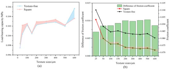 (a) Load-bearing capacity and (b) friction force variation of texture-free and square micro-texture surfaces with different texture sizes, at a depth of 5 µm and with an area ratio of 50%.