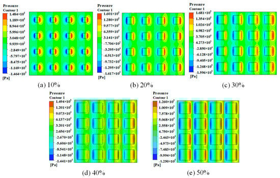 Pressure distributions of oil film on the square micro-texture surfaces with varying area ratios from 10% to 50% under different area ratios, at a depth of 5 µm and with a length of 500 µm.
