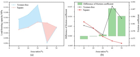 Figure 6 presents the oil film pressure distribution on square micro-texture surfaces with varying area ratios. It was observed that as the area ratios of the square texture escalated, the oil film pressure initially rose and, subsequently, diminished. Figure 7a shows the impact of the area ratio on the bearing capacity for the oil film on the square micro-texture surfaces and texture-free surfaces. Regarding the square micro-texture surfaces, the bearing capacity of the oil film increased as the area ratio rose from 10% to 30%, followed by a decrease from 30% to 50%, reaching its maximum and minimum at area ratios of 30% and 10%, respectively. Regarding the texture-free surfaces, the bearing capacity initially increased, followed by a decrease and then an increase. The maximum and minimum were obtained at the area ratios of 30% and 40%, respectively. However, the friction coefficient variation showed a different trend with the increased area ratio, as shown in Figure 7b. The friction coefficient initially decreased, followed by increasing and then decreasing for the texture-free surfaces, while for the square micro-texture surfaces, it continuously decreased. The maximum and minimum of both surfaces were obtained at the area ratios of 10%, 50%, 40%, and 30%, respectively. However, the maximum difference in the friction coefficient between the surfaces was obtained at the area ratio of 40%. This was because, on the one hand, the distribution of the micro-texture became denser with the increased area ratio, thus enhancing the hydrodynamic effect, resulting in the increased bearing capacity. On the other hand, the improved integrity of the oil film can reduce the direct contact between the friction pair and, thus, reduce the friction coefficient. However, the lubricant film could become unstable when the distribution of micro-texture becomes too dense, leading to a reduction in the bearing capacity.
