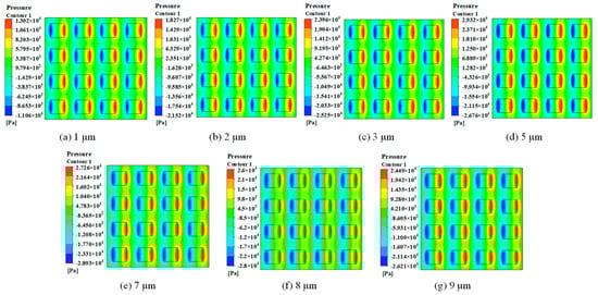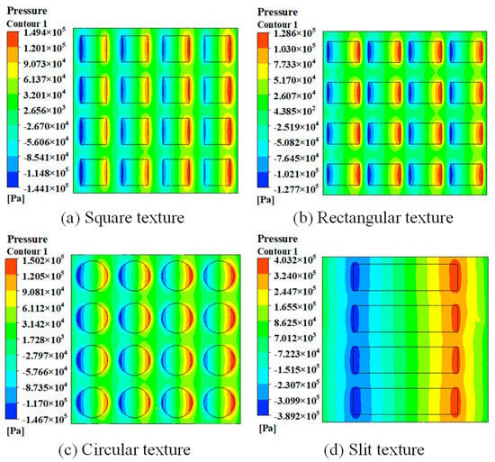 According to the pressure distribution shown in Figure 10a–d, the pressure difference between the middle columns of the square and the circular micro-texture surfaces was diminished. This may be attributed to the large flow space, leading to a lack of lubricant in the middle of the micro-texture and, thus, impeding the hydrodynamic effect of the fluid. In contrast, the rectangular and slit micro-texture produced a conduction effect on the fluid, enhancing the inertial effect. Simultaneously, the small exit area enhanced the hydrodynamic impact, and the pressure around the region with high pressure would have been more uniform because of the transmissibility of the hydrodynamic effect.