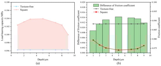 (a) Load-bearing capacity and (b) friction force variation of texture-free and square micro-texture surfaces at different depths, with an area ratio of 40% and a length of 500 µm.