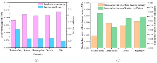 (a) Load-bearing capacity and friction force of different texture geometries with a length of 500 µm, an area ratio of 40%, and a depth of 5 µm. (b) Standard deviation of load-bearing capacity and friction coefficient under different variants.