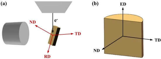 Samples subjected to deformation were cut along the compression axis diameter by EDM. Electron backscatter diffraction (EBSD) was performed on OXFORD NordlysMax2 (Oxford Instruments, Oxford, UK) to investigate the evolutions of grain size and misorientation distribution, as well as the dynamic recrystallization (DRX) during the hot compression. The relative orientation between the sample coordinate system and the scanning electron microscope (SEM) system coordinate system is shown in Figure 1. The compression direction (ED) of the sample was parallel to RD direction in the EBSD coordinate system, and the ND plane was the observation plane. The EBSD samples were mechanically grinded and then electrolytically polished at a voltage of 15 V for 30 s. The electrolyte consisted of phosphoric acid and ethanol, with a volume ratio of 1:1. During the EBSD test, the scanning step size was determined according to the grain size of the sample, which was between 1 and 3 µm. The CHANNEL 5 software was used for data analysis. A lower limit boundary-misorientation cutoff of 2° was used, and a 15° criterion was employed to differentiate low-angle GBs (LAGBs) and high-angle GBs (HAGBs).