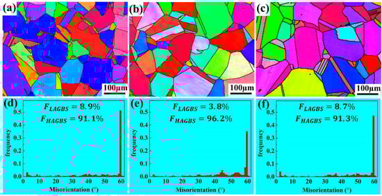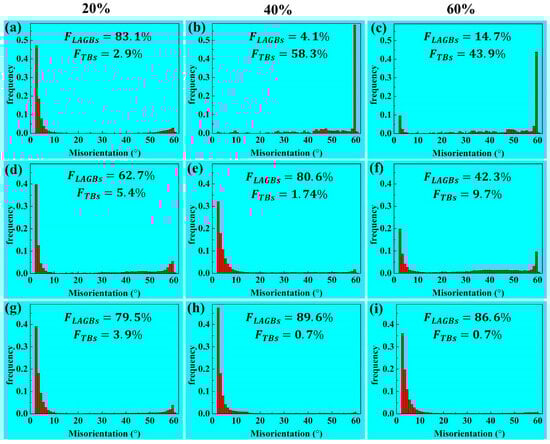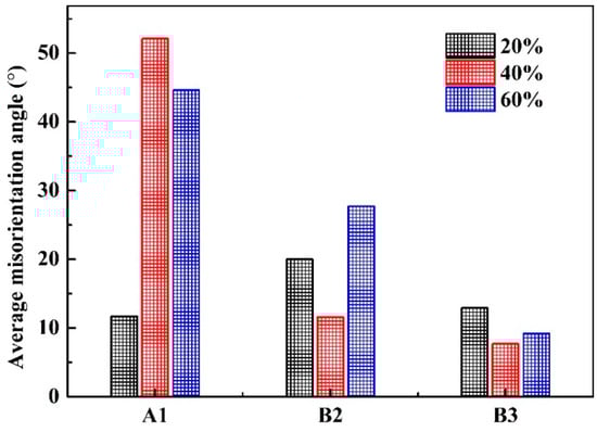 The misorientation distributions of the A1, B2, and B3 coppers under different deformation amounts are shown in Figure 6, and the corresponding average angles are presented in Figure 7. In Figure 6a–c, it is observed that with the increase in reduction, the volume fractions of LAGBs in A1 copper are 83.1%, 4.1%, and 14.7%, respectively, with the average misorientation values of 11.7°, 52.1°, and 44.6°. At the initial stage of deformation, the content of LAGBs is very high, so the dislocation slip dominates the deformation process. When the deformation amount exceeds 40%, the content of TBs increases dramatically, turning the primary deformation mechanism from the dislocation slip to twinning.