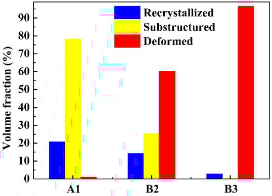 In order to investigate the influence of trace Bi impurities on DRX of the 7N pure copper, the proportions of different types of grains in A1, B2, and B3 coppers at a compression deformation of 60% are statistically analyzed, and the results are shown in Figure 8. The blue column represents recrystallized grains. The yellow column represents substructured grains, which are in a state between the recrystallized and deformed grains. The red column represents deformed grains, in which the density of dislocations is high. It is obvious that the volume fraction of DRX grains in A1 copper is 20.8%, and almost no deformed grains. However, the volume fractions of DRX grains in B2 and B3 copper are 14.41% and 2.9%, respectively, and the contents of deformed grains are greater than 60%. Therefore, it can be seen that a trace Bi addition can inhibit the DRX of 7N copper, and the higher concentration of Bi impurities, the greater inhibition effect on the DRX process. This correlation occurs because the higher content of adsorbed Bi atoms at GBs can significantly release the stress concentration, which impedes the nucleation and growth of DRX grains.