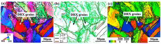 In addition to the DRX process, trace impurities can also affect the DRX mechanism of copper and copper-based alloys [,,,,]. Figure 9 shows the formation characteristics of DRX grains in 7N copper at the initial deformation stage. As observed in Figure 9a,b, DRX grains mainly nucleate and grow at GBs, which conform to the typical discontinuous dynamic recrystallization (DDRX) mechanism of metals with low-stacking fault energies (SFE) [,]. Figure 9c shows the corresponding Taylor factor diagram, where the larger Taylor factor value represents higher deformation storage energy inside the grain [,,]. Due to the high deformation temperature, a sufficient driving force is provided for the growth of DRX grains, and most of the DRX grains have completed the DRX process. In addition, these DRX grains have low Taylor factor values, indicating that the dislocation density within the grains is significantly reduced, as shown in Figure 9c.