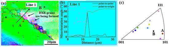 Formation characteristics of the DDRX grains in B3 copper deformed at 600 °C with a deformation of 40%: (a) orientation map; (b) orientation distribution of Line 1; (c) IPF map corresponding to each grain.