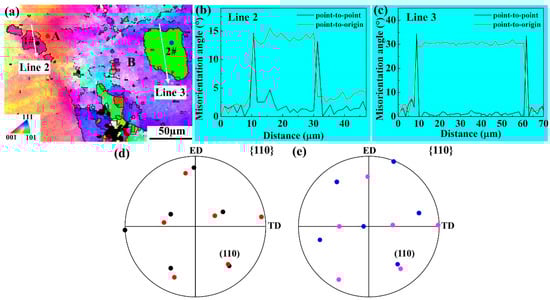 Formation characteristics of the CDRX grains in B3 copper deformed at 600 °C with a deformation of 40%: (a) orientation map; orientation distribution of (b) Line 2 and (c) Line 3; (c) {110} pole figures of (d) 1# DRX grain and (e) 2# DRX grain.