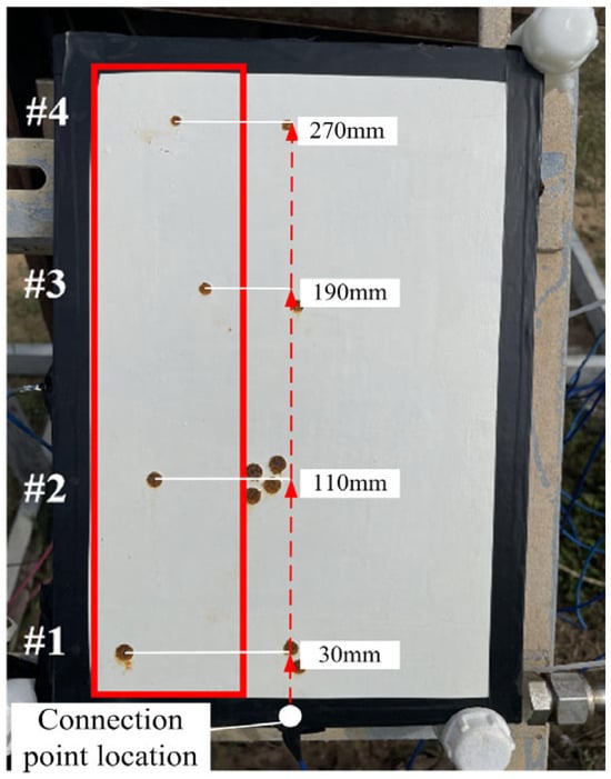 The location of the marine atmospheric exposure experiment was the atmospheric corrosion exposure site on Donghai Island, Zhanjiang, China. Zhanjiang city is regulated by a marine climate, with an annual average temperature of 23.2 °C, an annual average humidity of 88%, and an average Cl− deposition rate of 58.2 mg·m−2·d−1, which is typical of a high-temperature, high-humidity, high-salt, and high-radiation marine atmospheric corrosion environment. The coating samples were surrounded by insulating tape, and silicone rubber was applied to the soldered wires. To ensure that the requirements of cathodic protection are met, the coating damage rate needs to be set as small as possible. Therefore, the coating damage rate is defined as the percentage of the coating’s damaged area relative to the effective area (19.6 cm2) of the electrochemical test on the coating. According to the orthogonal experimental design, circular defects with areas of 19.6 mm2, 39.2 mm2, 58.8 mm2, and 78.4 mm2 were created on the coating surface using a puncher, simulating coating damage rates of 1%, 2%, 3%, and 4%, respectively. Four test points were set to 30 mm, 110 mm, 190 mm, and 270 mm from the negative position of the grounding point and labeled test points #1, #2, #3, and #4, respectively. A DC-regulated power supply was used to apply 0.6 V, 0.7 V, 0.8 V, and 0.9 V to the four coating samples, and then, the samples were placed in the Donghai Island atmospheric corrosion exposure field to conduct outdoor exposure experiments for 20 days. The hanging samples are shown in Figure 2.