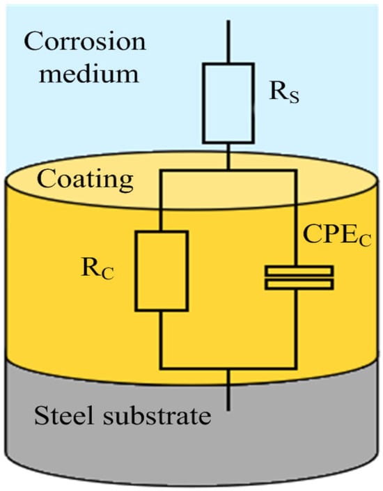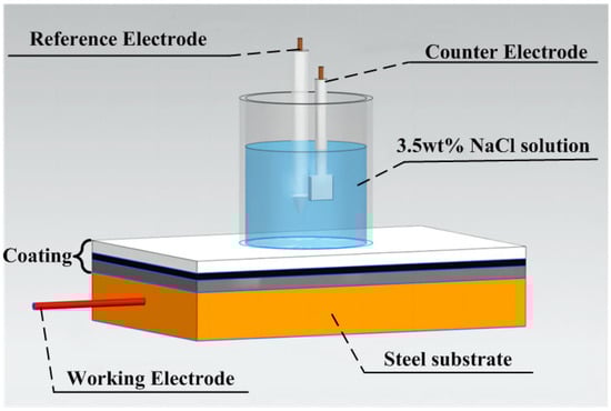 Electrochemical tests were performed using the CS350 electrochemical workstation provided by Wuhan Corrtest Instrument Co., Ltd., Wuhan, China. Figure 3 is the schematic diagram of the electrochemical test system for the coating. The traditional three-electrode system is adopted. In the electrolytic cell, Ag/AgCl is used as the reference electrode, the sample is the working electrode, and the platinum sheet is the auxiliary electrode. The effective area of the test is 19.6 cm2. All electrochemical tests were performed in 3.5 wt% NaCl solution at 25 °C. The samples underwent a series of electrochemical tests, including an open-circuit potential (OCP) test for 300 s, an electrochemical impedance spectroscopy (EIS) test, and a potentiodynamic polarization curve test. The EIS test parameters include a test frequency range of 105–10−2 Hz and an AC excitation signal amplitude of 10 mV. The parameters of the potentiodynamic polarization curve test include a scanning range of 0.05 V and a scanning rate of 0.1 mV/s.