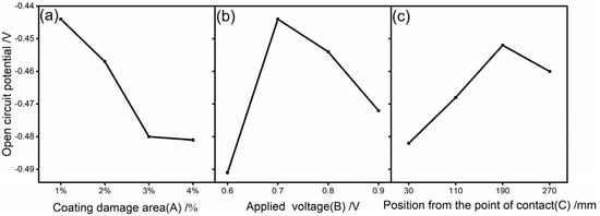 Figure 4 shows the change in the open-circuit potential under different influencing factors. Figure 4a shows that when the damage rate was 1%, the coating’s open-circuit potential was the highest, and the coating’s barrier performance was the best. When the coating’s damage rate of 1% increased to 2% and the open-circuit potential decreased by 0.013 V, the tendency toward corrosion began to increase. The damage rate of 3% was no longer consistent with the principle of a microporous-filling electrolyte, the loss of applied current cathodic protection, and the bare substrate coming into contact with the corrosive medium, resulting in the lowest open-circuit potential and severe corrosion. Figure 4b shows that an applied voltage of 0.6 V when the metal substrate was in a state of under-protection resulted in the lowest open-circuit potential. The open-circuit potential was greater at 0.7 V, which resulted in the best protection performance for the broken coating samples. Figure 4c shows that the change in the position from the grounding point had the smallest influence on the open-circuit potential, and the fluctuation interval was 0.03 V. The cathodic protection effect was the best at a distance of 190 mm from the grounding point, and the different positions from the grounding point affected the migration and diffusion of the charged ions, which influenced the effect of cathodic protection. A comprehensive analysis revealed that the optimal protection parameters of the graphene composite conductive coating in the marine atmospheric environment were an applied voltage of 0.7 V, a damage rate of ≤1%, and a distance of 190 mm from the junction point.