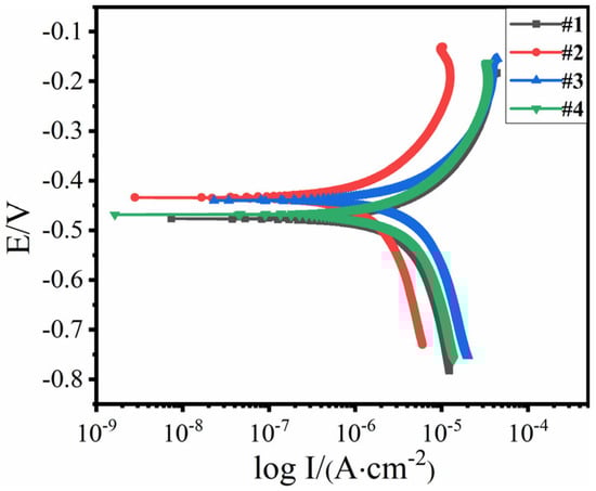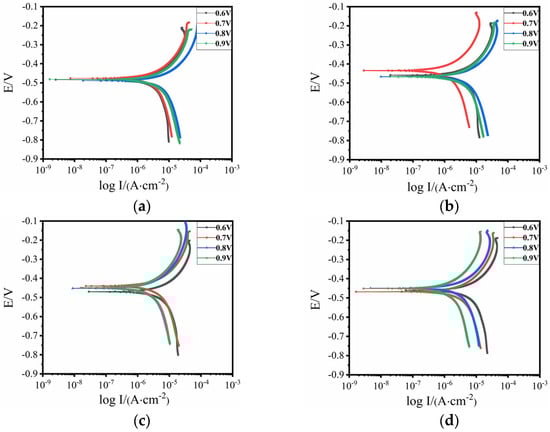 Figure 5 shows the potentiodynamic scanning curves of each test point under different applied voltages. Overall, the corrosion potential of the sample under the applied voltage of 0.7 V was the highest, the surface coating had good protective performance [], and the metal substrate had the lowest corrosion tendency.
