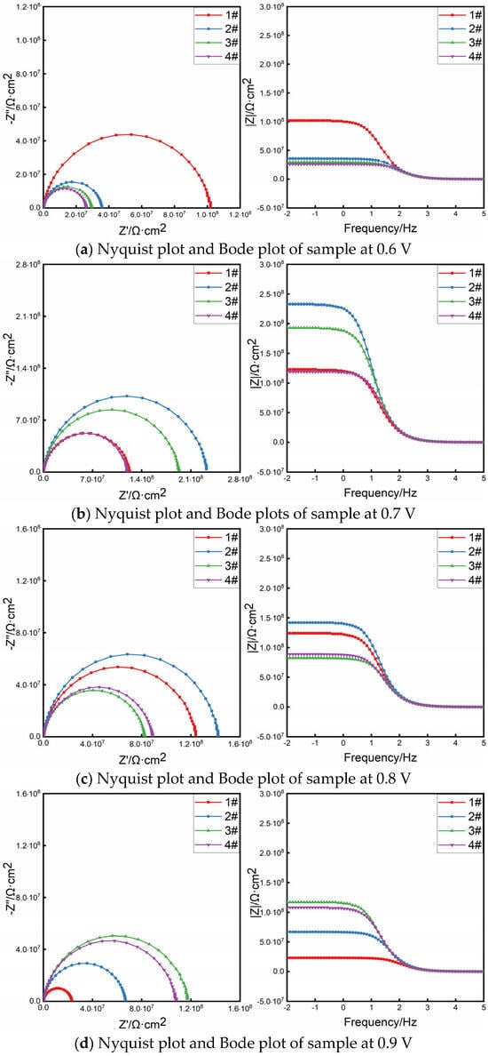Figure 9 shows the Nyquist diagram and Bode diagram of the coating sample at different voltages. The radius of the capacitive arc reflects the impedance of the material in the corrosive medium. The larger the radius of the capacitive arc, the higher the impedance, and the better the corrosion resistance of the material [,]. It can be seen from Figure 9b that when the optimal cathodic protection voltage is 0.7 V, the radius of the impedance arc increases first and then decreases with the increase in the distance between the test points. The radius of the impedance arc at test points #2 and #3 is larger than that at both ends, indicating that the charge transfer resistance of test points #2 and #3 in the middle area of the coating is large and the corrosion rate is low [].
