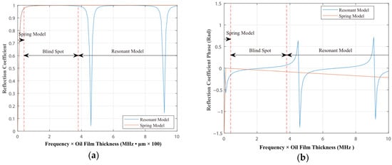 To comprehensively demonstrate the relationship between the reflection coefficient, the acoustic wave frequency, and the oil film thickness, we set the parameter frequency × oil film thickness as the independent variable to analyze the relationship between the three parameters. The variation of the reflection coefficient amplitude and phase based on frequency × oil film thickness (f × d) is shown in Figure 2. When f × d is less than 80, the oil film thickness is calculated using the spring model; when f × d is greater than 380, the oil film thickness is calculated using the resonance model. The range between 80 and 380 represents the blind zone between the spring and resonance models, where neither of the two models can accurately measure the thickness of the bearing oil film. Therefore, the phase shift model measures the oil film thickness within the blind zone range.